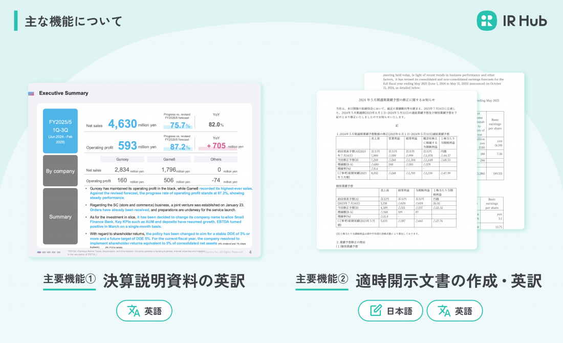 株式会社Gunosy(本社:東京都渋谷区、代表取締役社長:西尾健太郎、以下「Gunosy」)は、開示業務支援クラウドサービス「IR Hub(アイアールハブ)」において、決算説明資料の英訳作成時に、レイアウトを自動で調整する機能を正式にリリースしたことをお知らせします。