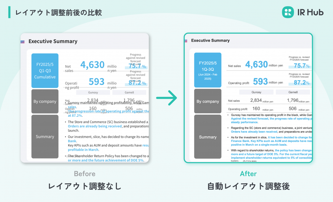 開示業務支援クラウド 「IR Hub」にて、決算説明資料の英訳作成時における自動レイアウト機能を正式リリース ~フォントサイズや配置の微調整作業から担当者を解放し、英文開示業務の生産性を劇的に向上~