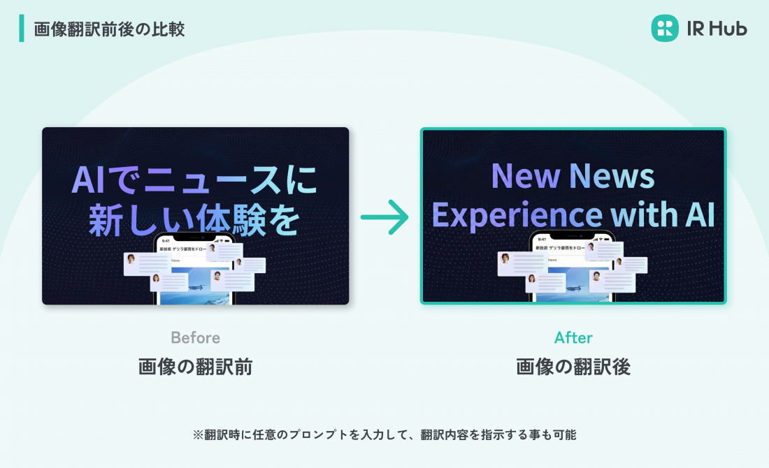 「IR Hub」は生成AIを活用し、画像内のテキストを翻訳します。翻訳の要否はユーザーが画像ごとに個別選択できるため、ブランドロゴ等、翻訳したくない画像を確実に除外できます。さらに画像内の一部のテキストは翻訳したくない場合、ユーザーによる指示によって、部分的な翻訳も可能となります。