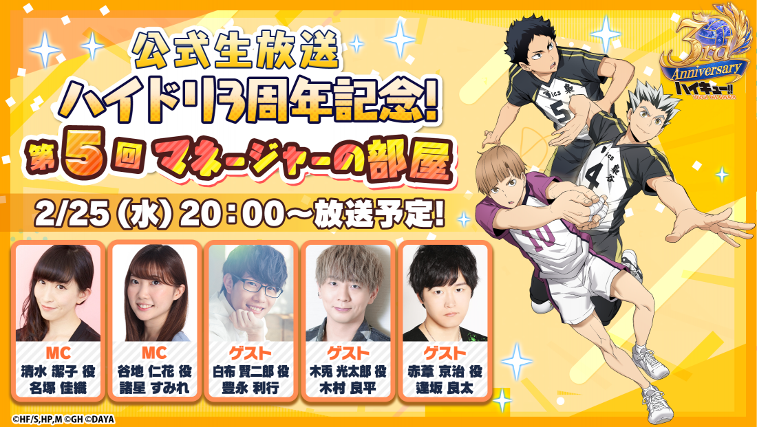 過去に実施した生放送と同様、烏野高校排球部マネージャー清水潔子 役「名塚佳織さん」、同じくマネージャーの谷地仁花 役「諸星すみれさん」がMCを務めます。