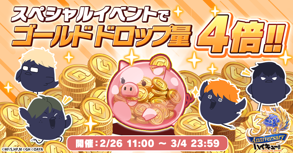 株式会社Gホールディングスは、アニメ『ハイキュー!!』のスマートフォンゲーム『ハイキュー!! TOUCH THE DREAM』略称『ハイドリ』の3周年を記念して、2026年2月24日(火)より3周年キャンペーンの開催、2026年2月25日(水)20時00分よりスペシャルなゲストをお迎えして3周年記念生放送を実施いたしますことをお知らせいたします。